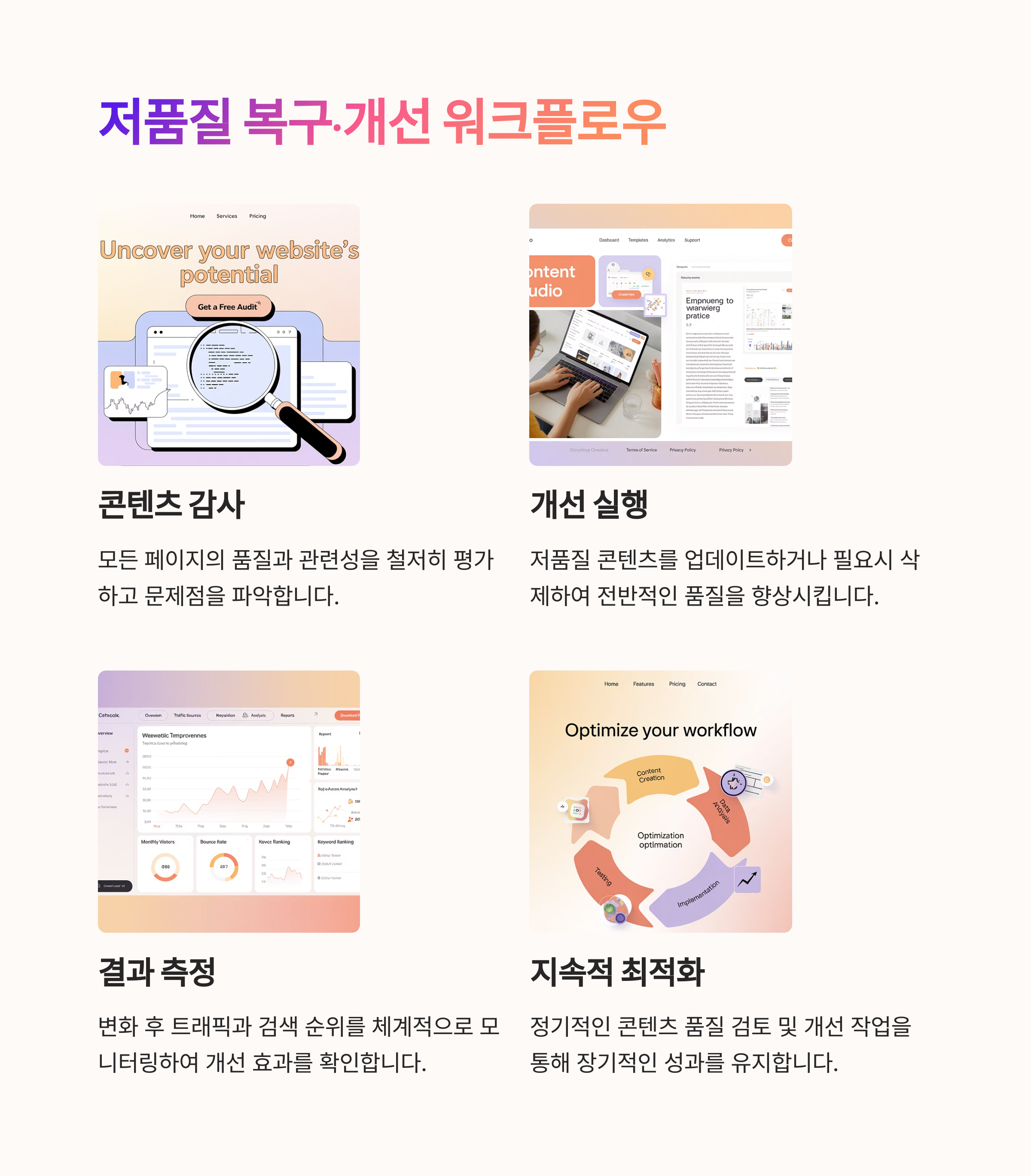 저는 콘텐츠가 저품질로 진단되면 아래 워크플로우에 따라 순차적으로 복구 작업을 합니다. AI로 진단하고, 수동으로 조정하되, 재발 방지를 위한 개선 요소까지 포함하죠. 특히 본문 내용을 무작정 삭제하기보단, 독자 경험 기준으로 정보 구조를 재정리하는 게 훨씬 효과적이에요.