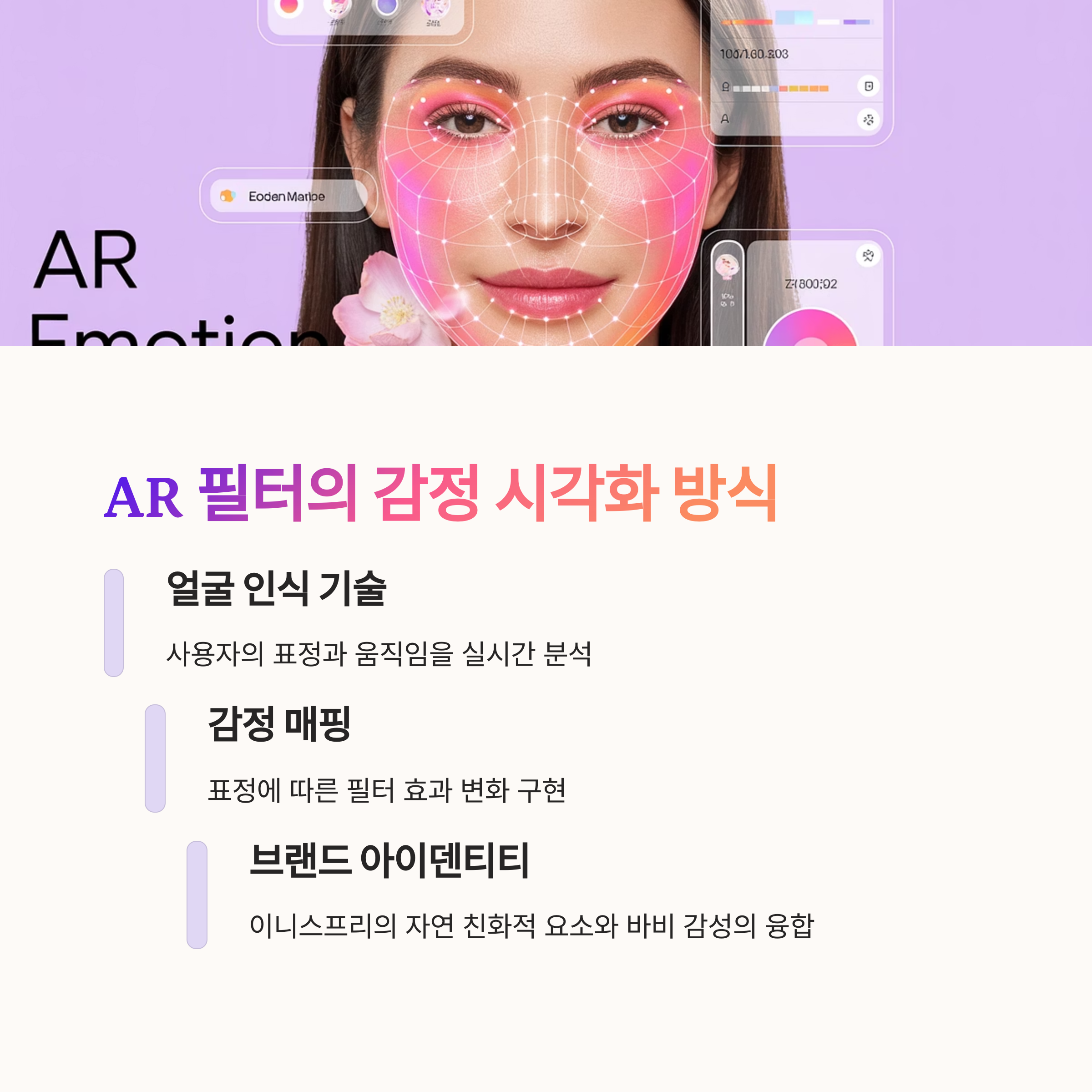 이니스프리는 단순히 얼굴을 꾸며주는 필터를 만든 것이 아닙니다. 이 필터는 사용자의 감정 표현을 인식하고, 그 감정을 증폭시키는 비주얼 피드백을 설계했습니다. 감정이 전면에 드러나는 얼굴 제스처(웃음, 윙크, 눈썹 움직임 등)에 반응하여 화려한 반짝임, 디지털 아우라, 핑크 스파크 이펙트가 실시간으로 발생했죠.