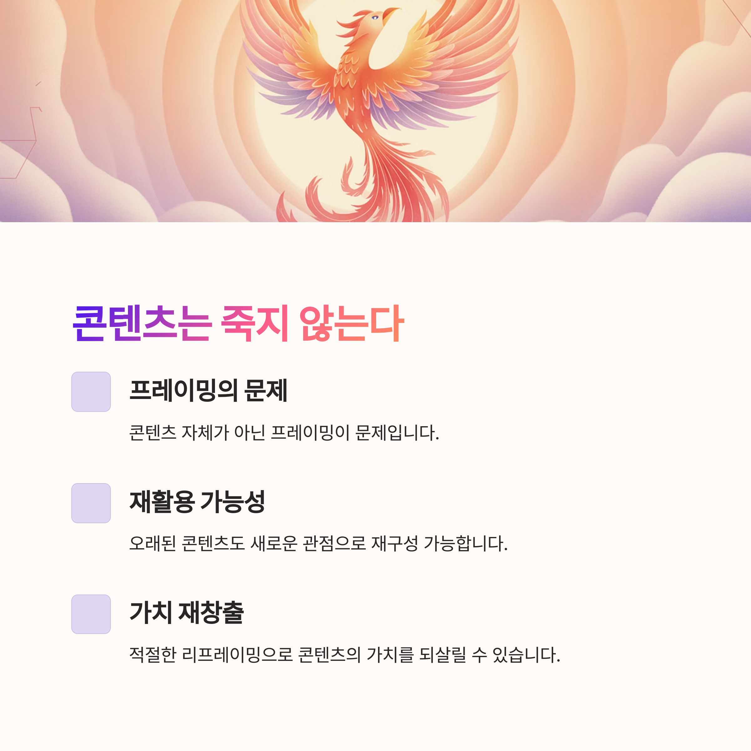 지금 당신의 서버에 묻혀 있는 콘텐츠들은, 리마스터링을 통해 또 한 번의 전성기를 누릴 수 있습니다. 리프레이밍은 단순한 재활용이 아닌, 전략적 진화입니다. 이제 당신의 콘텐츠에게도 두 번째 생명을 주세요.