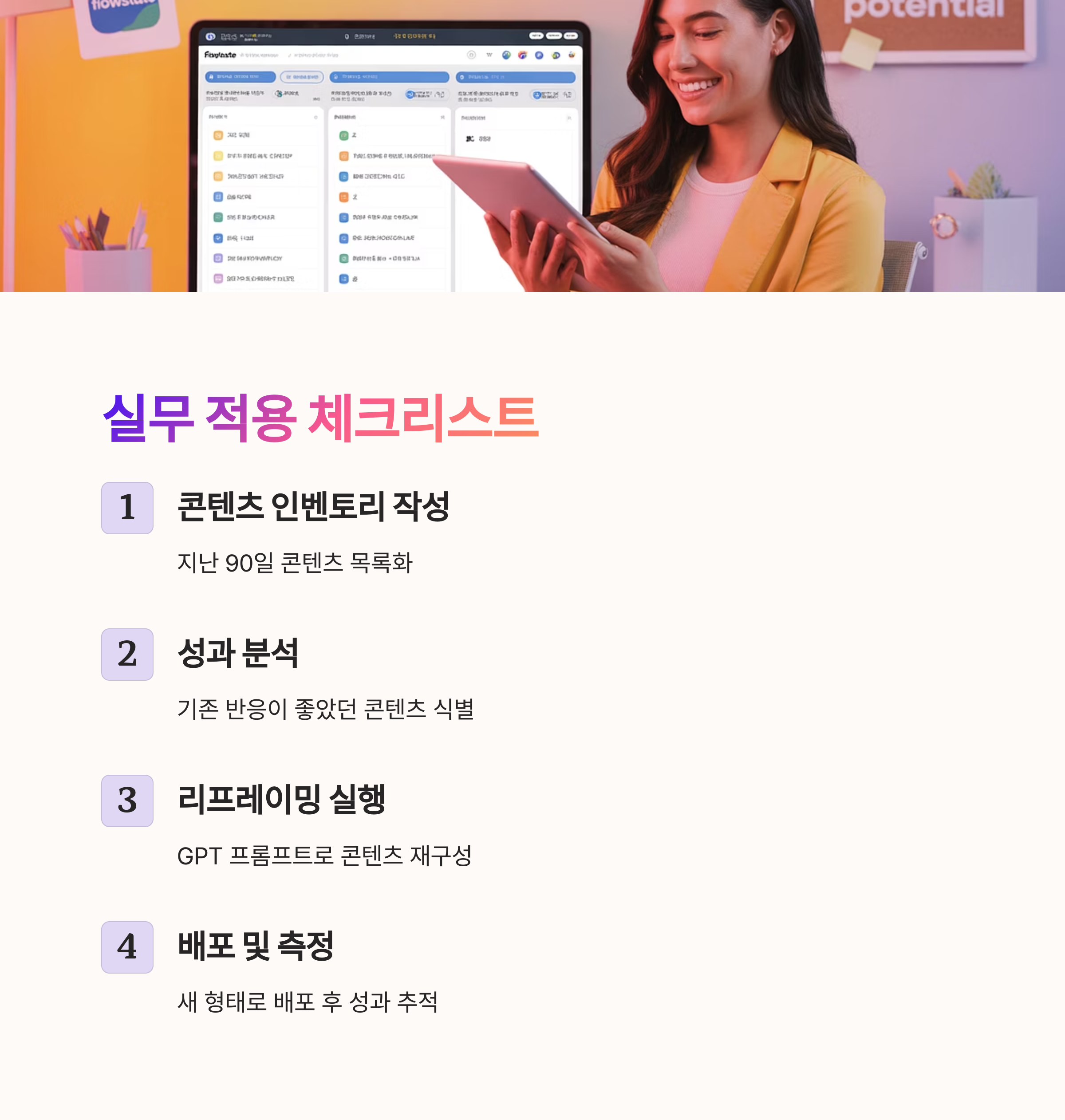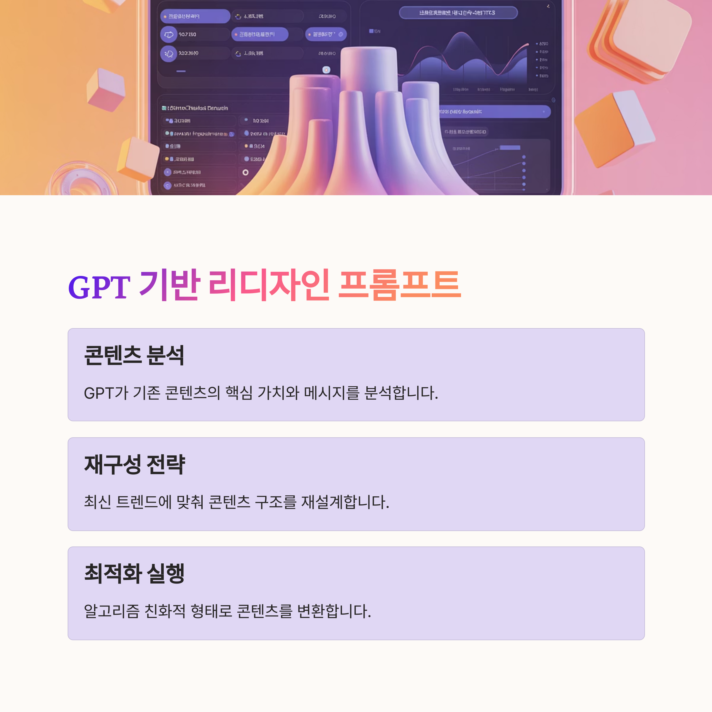 GPT는 ‘새로운 글을 써주는 AI’가 아닙니다. 기존 콘텐츠를 리디자인하는 데 매우 탁월한 도구입니다. 특히 AI에 아래처럼 목적과 형식을 명확히 알려주면, 완전히 새로운 포맷으로 재해석된 콘텐츠를 제공합니다.