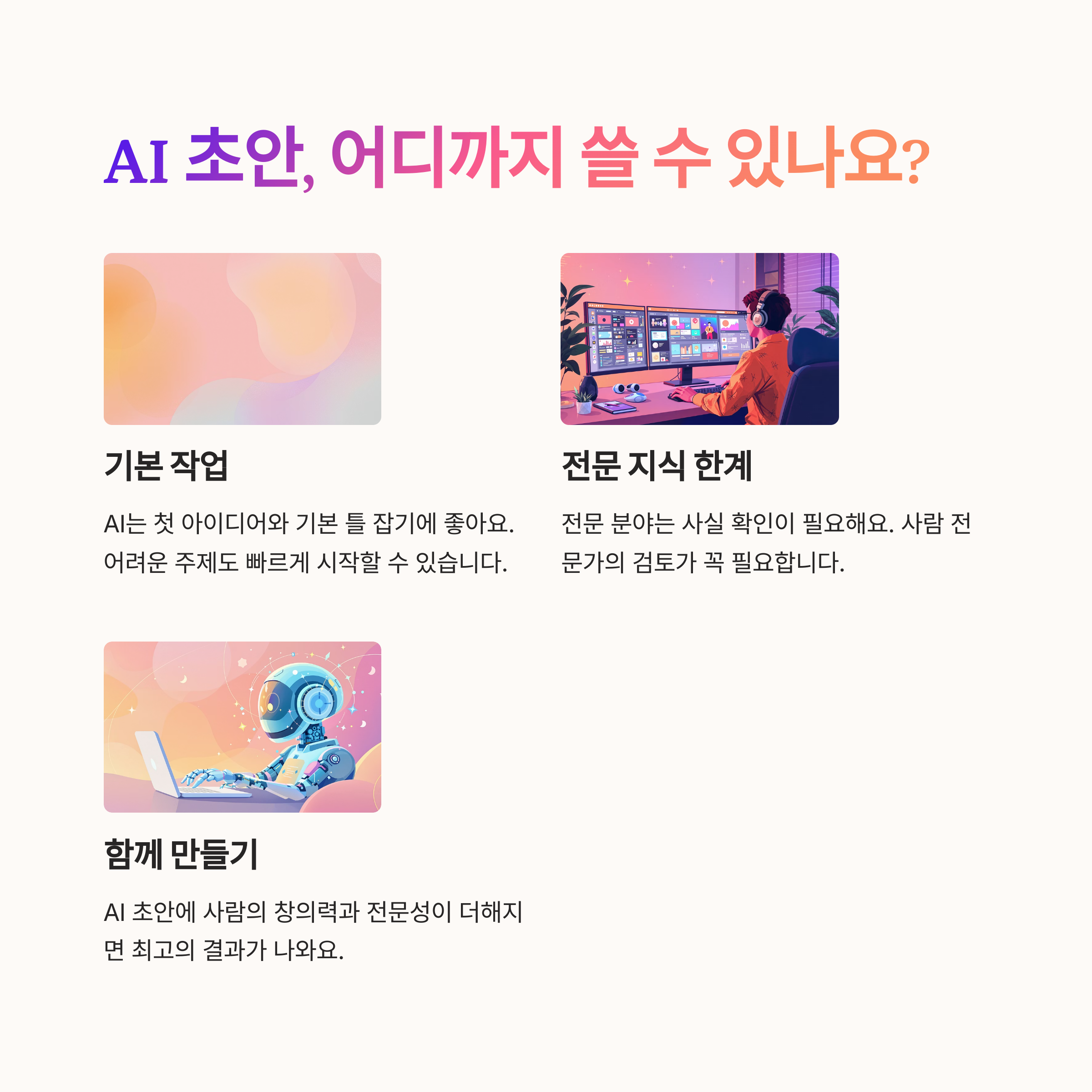 중요한 건 ‘사람의 개입 포인트’를 전략적으로 설계하는 겁니다. 이 구조를 잘 만들면, AI는 번거로운 초안에서 벗어나 창작을 돕는 최고의 보조자가 될 거예요.