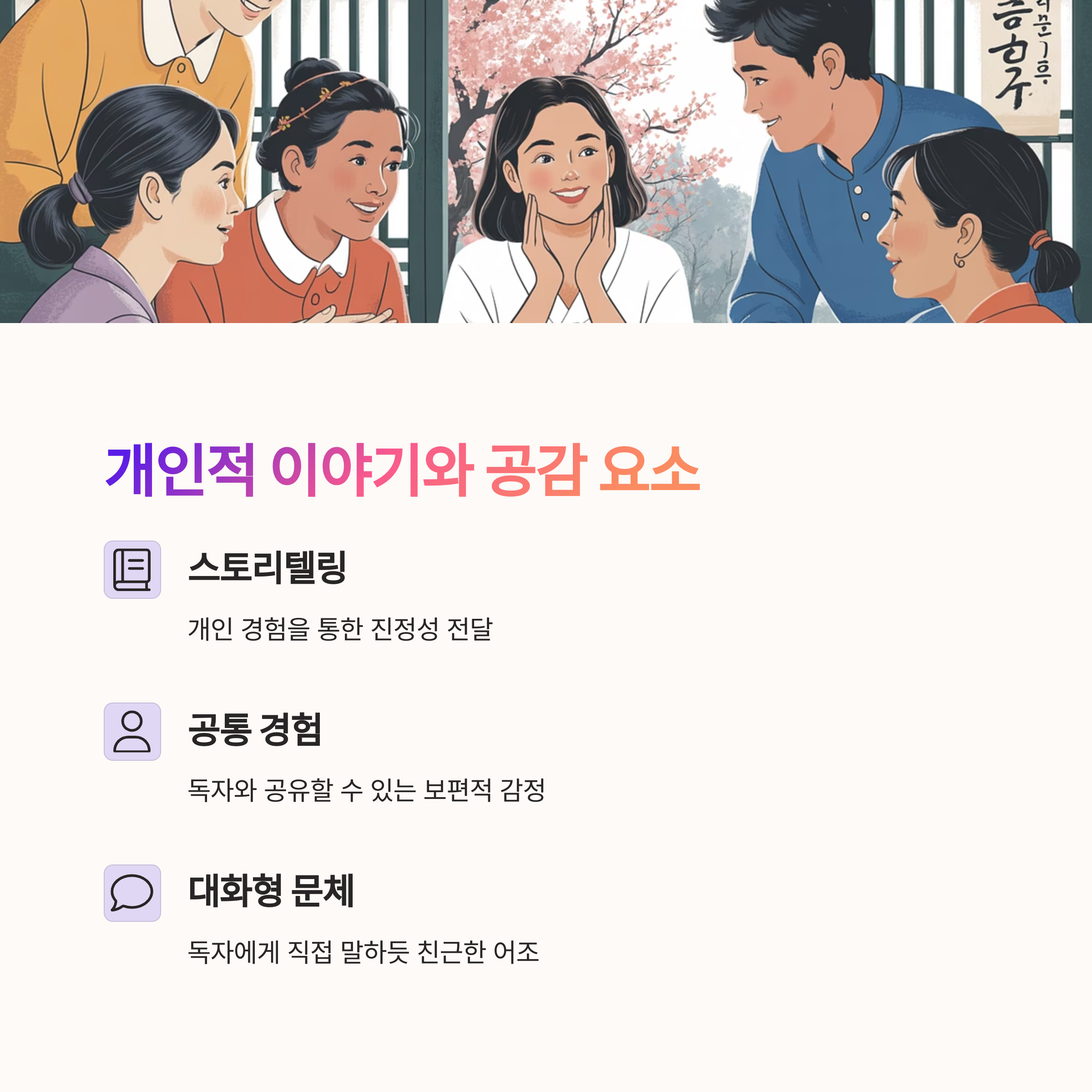 - 결론부에 독자와 감정 공유 질문 유도