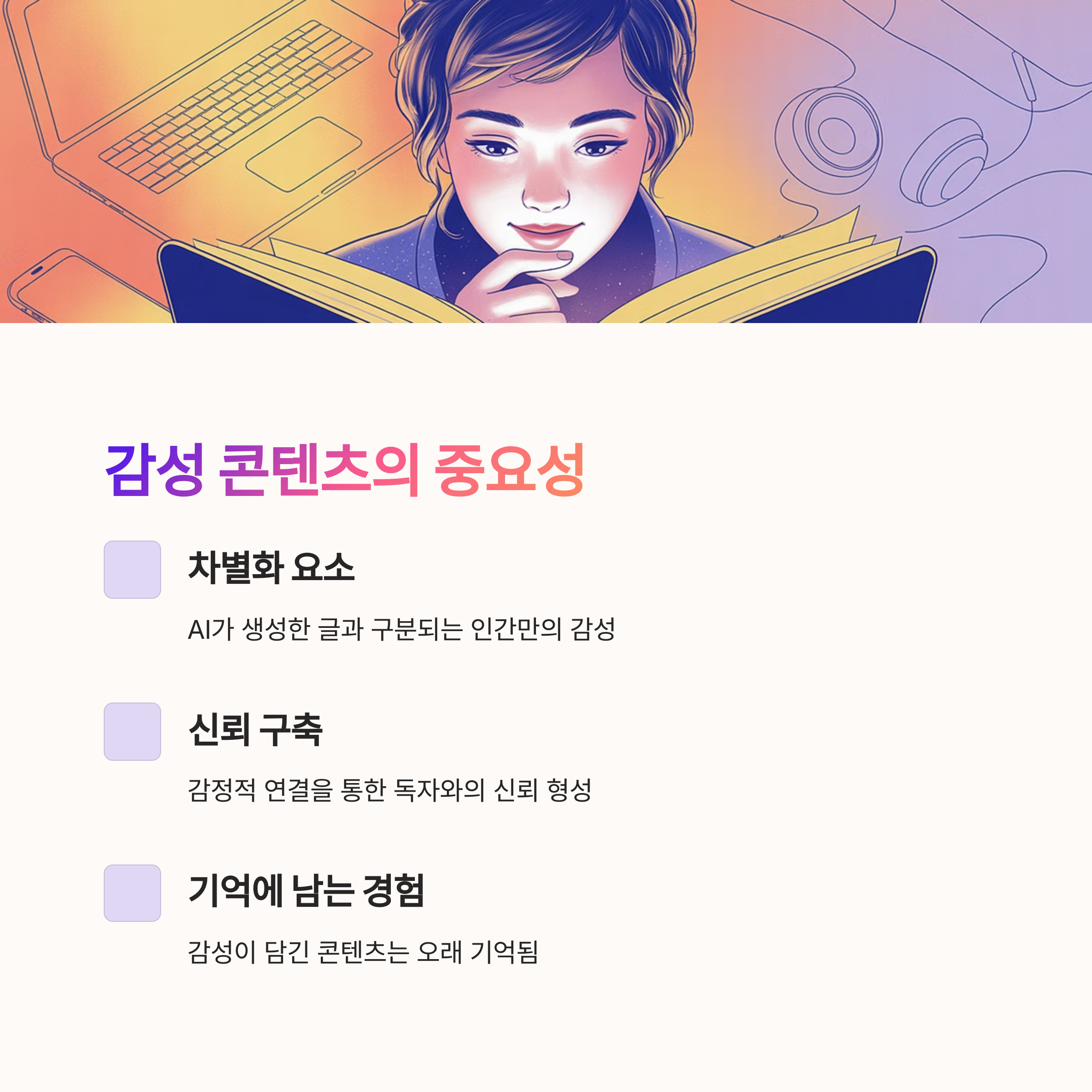 기술은 콘텐츠를 빠르게 만듭니다. 하지만 독자의 마음을 움직이는 건 언제나 감정입니다.