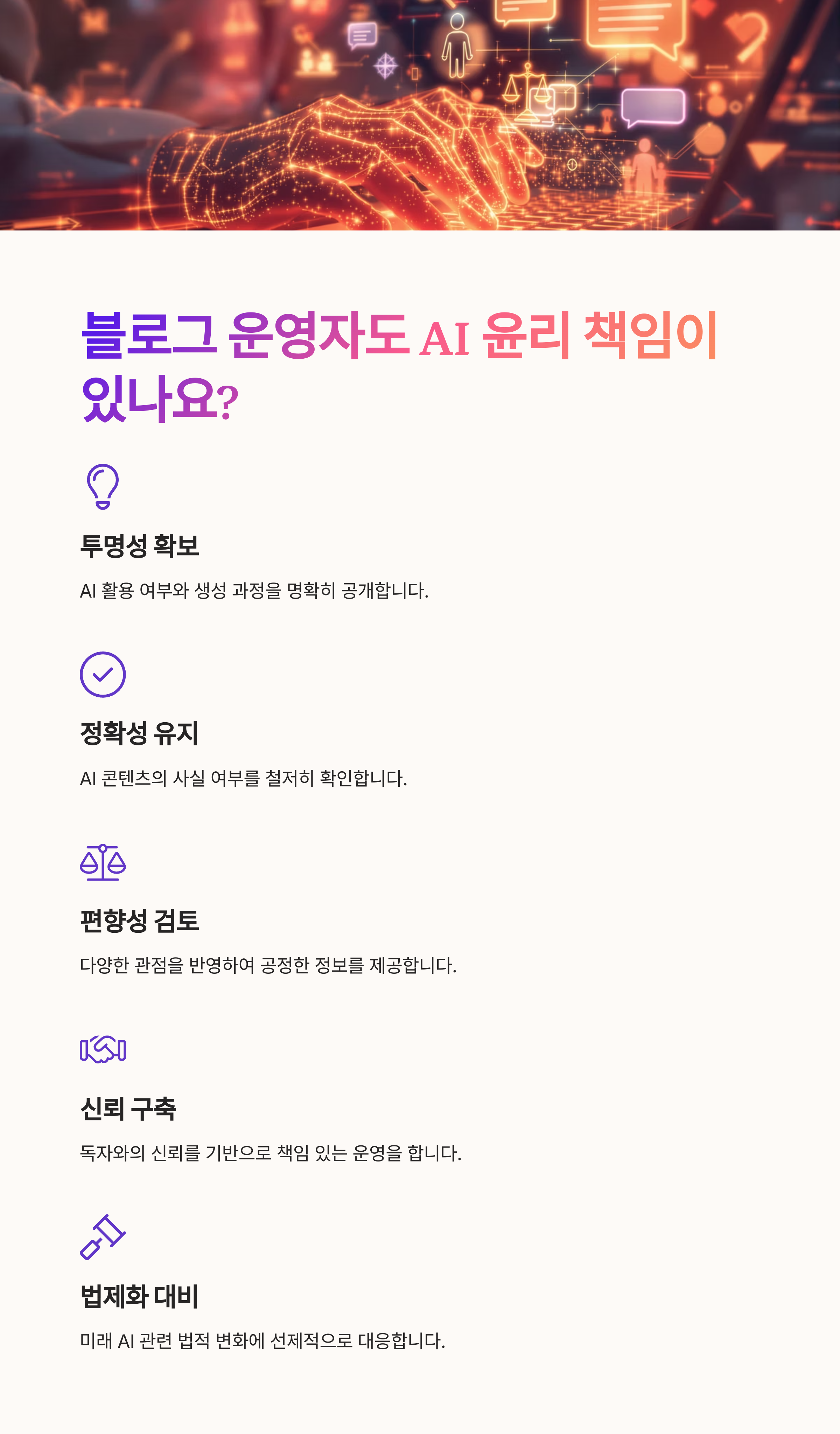 AI 시대, 기술보다 더 중요한 건 ‘어떻게 써야 하는가’입니다. 콘텐츠 제작자와 플랫폼 운영자에게도 윤리와 공정성은 선택이 아닌 필수가 되었습니다.