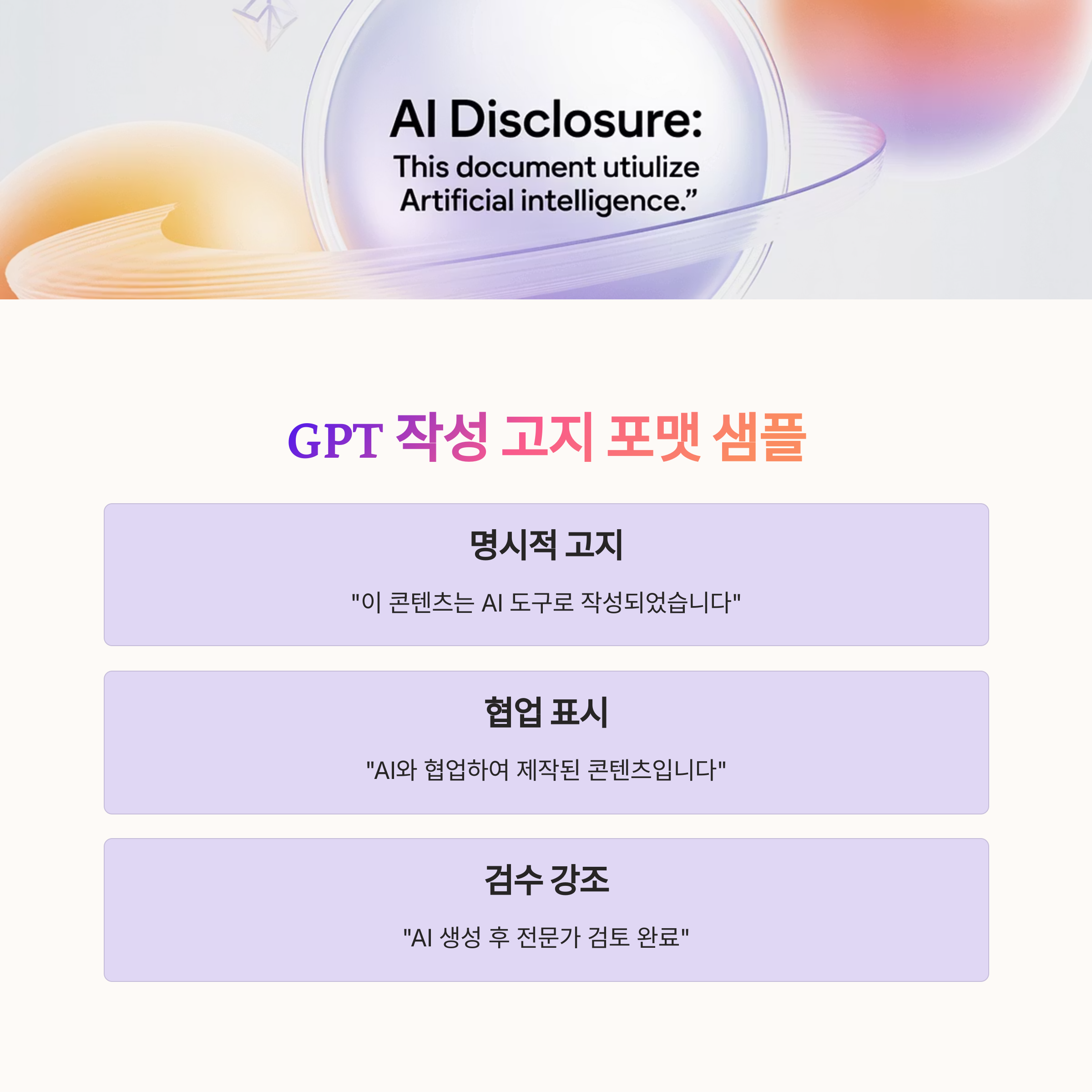 신뢰를 위해선 독자에게 투명하게 밝혀야 해요. GPT 또는 기타 생성형 AI를 사용했다면, 명확하게 고지하는 게 원칙입니다. 아래는 실제로 사용할 수 있는 포맷 예시예요.