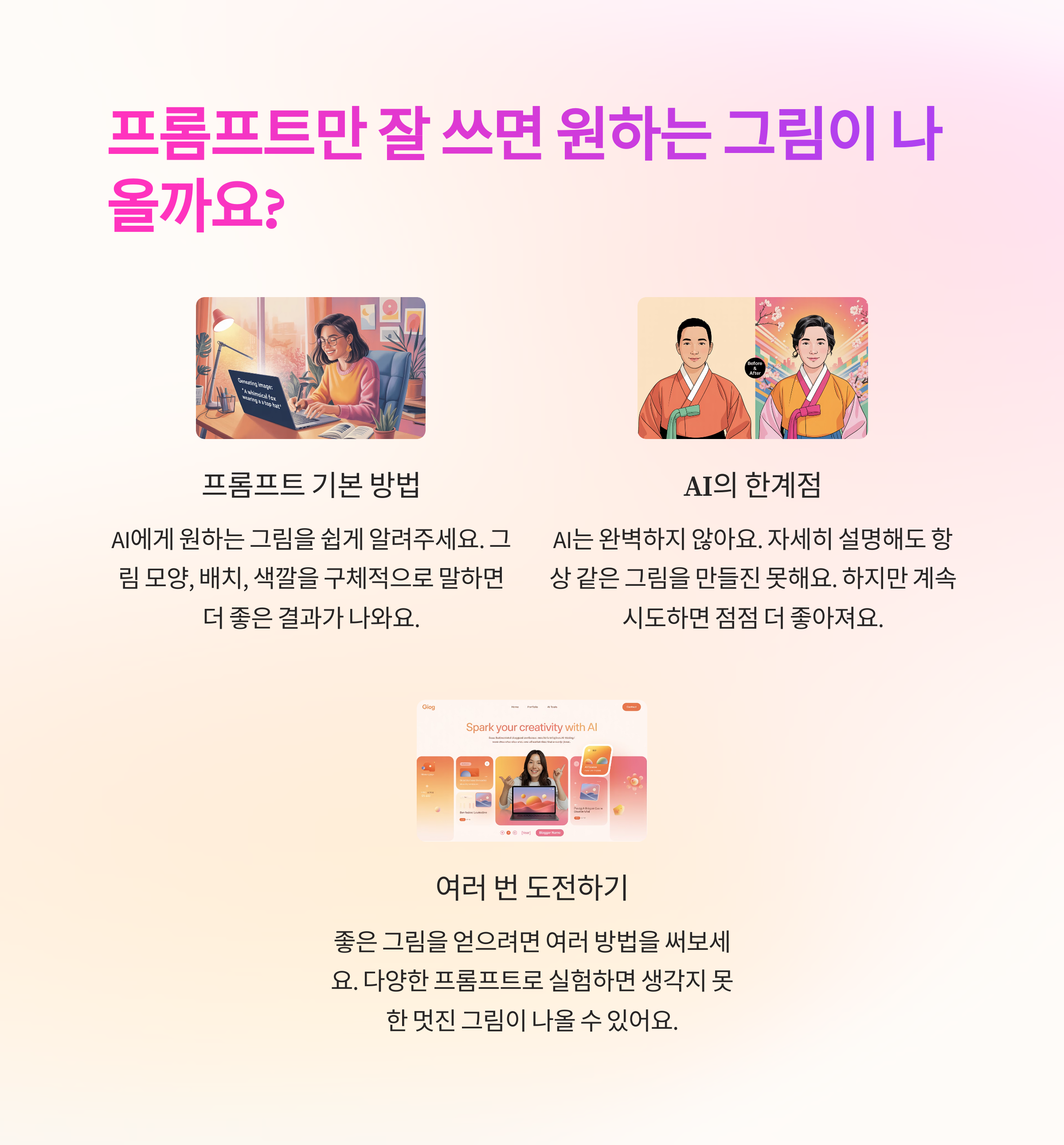 불과 몇년 전만 해도 무료 이미지 사이트 뒤지느라 시간 다 보냈는데, AI 이미지 생성 툴을 쓰고 나선 세상이 완전 달라졌어요. 텍스트만 입력해도 원하는 그림, 영상이 뚝딱 나오니 블로그 운영이 훨씬 즐거워졌죠. 심지어 숏폼 영상도 AI로 자동 제작하는 요즘, 정말 상상 이상으로 빠르고 재밌게 결과물이 나옵니다. 오늘은 직접 써보고 검증한 AI 비주얼 콘텐츠 확장법, 브랜딩 노하우까지 아낌없이 전수할게요!