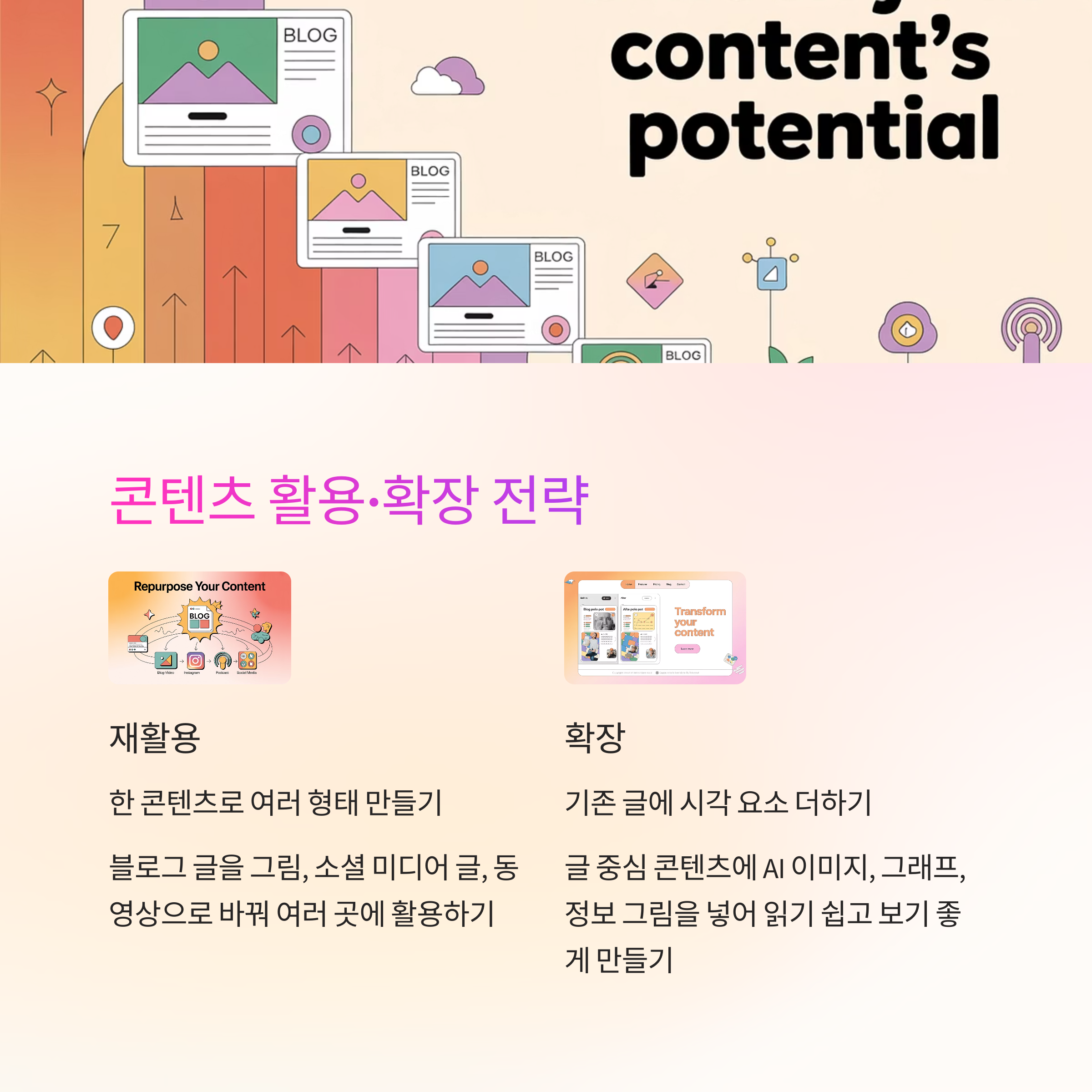 AI로 만든 이미지는 단순 장식이 아니라, 콘텐츠 파워업의 핵심입니다. 블로그 본문 삽입은 기본, 썸네일, 카드뉴스, 전자책 표지, 강의자료, SNS 광고까지 한 번 만든 이미지/영상으로 ‘2차, 3차 활용’이 무한대! 실제로 저도 미드저니·캔바로 만든 이미지를 인스타그램 릴스·유튜브 쇼츠·네이버 포스트 등 다양한 채널에 맞게 변환·확장하고 있어요. 시각 자료 하나가 브랜드 전체의 통일성과 임팩트를 살려줍니다.