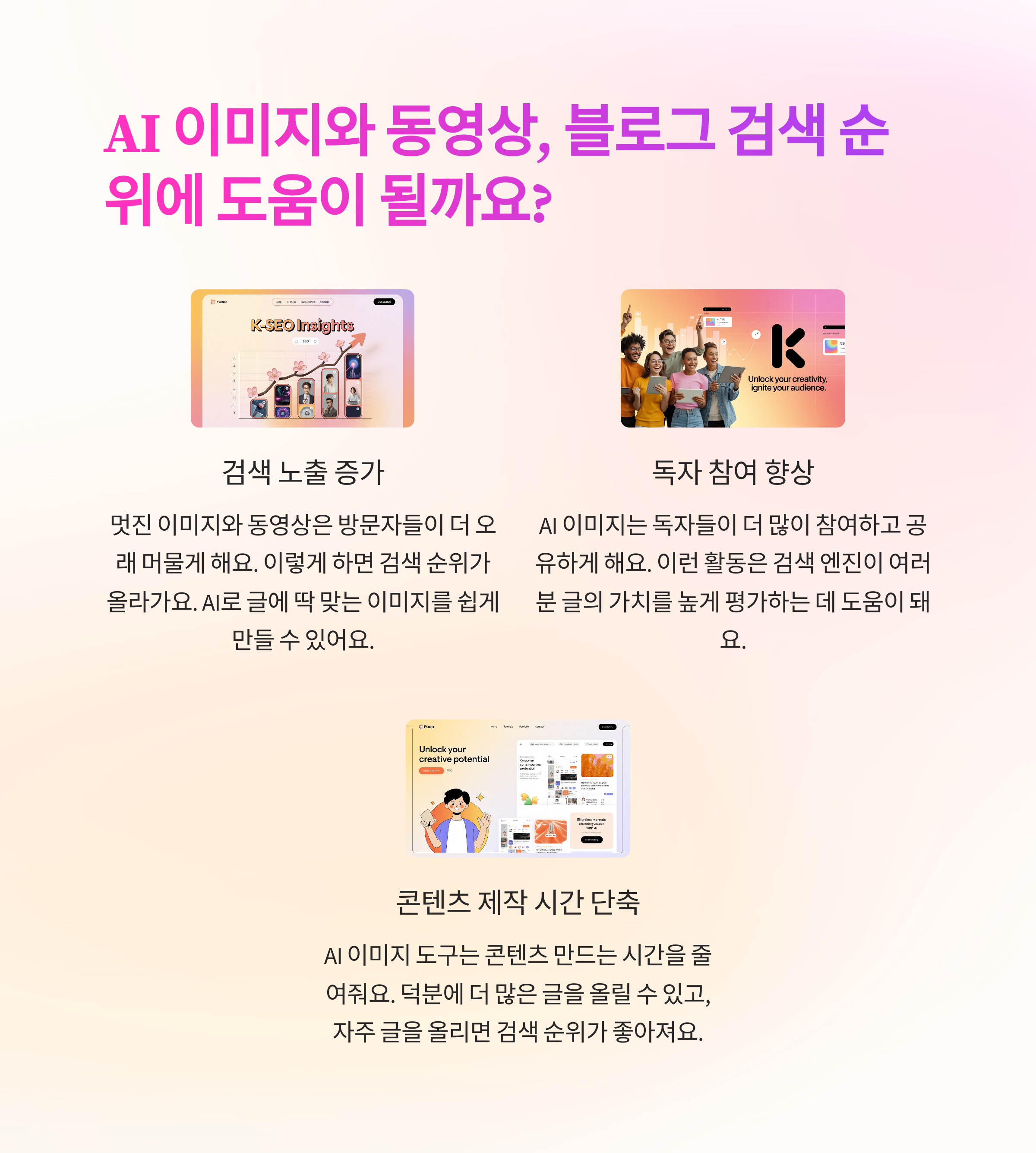 네! 고유 이미지·영상은 검색엔진에 더 잘 노출되고, 방문자 체류시간·구독률까지 함께 높여줍니다.