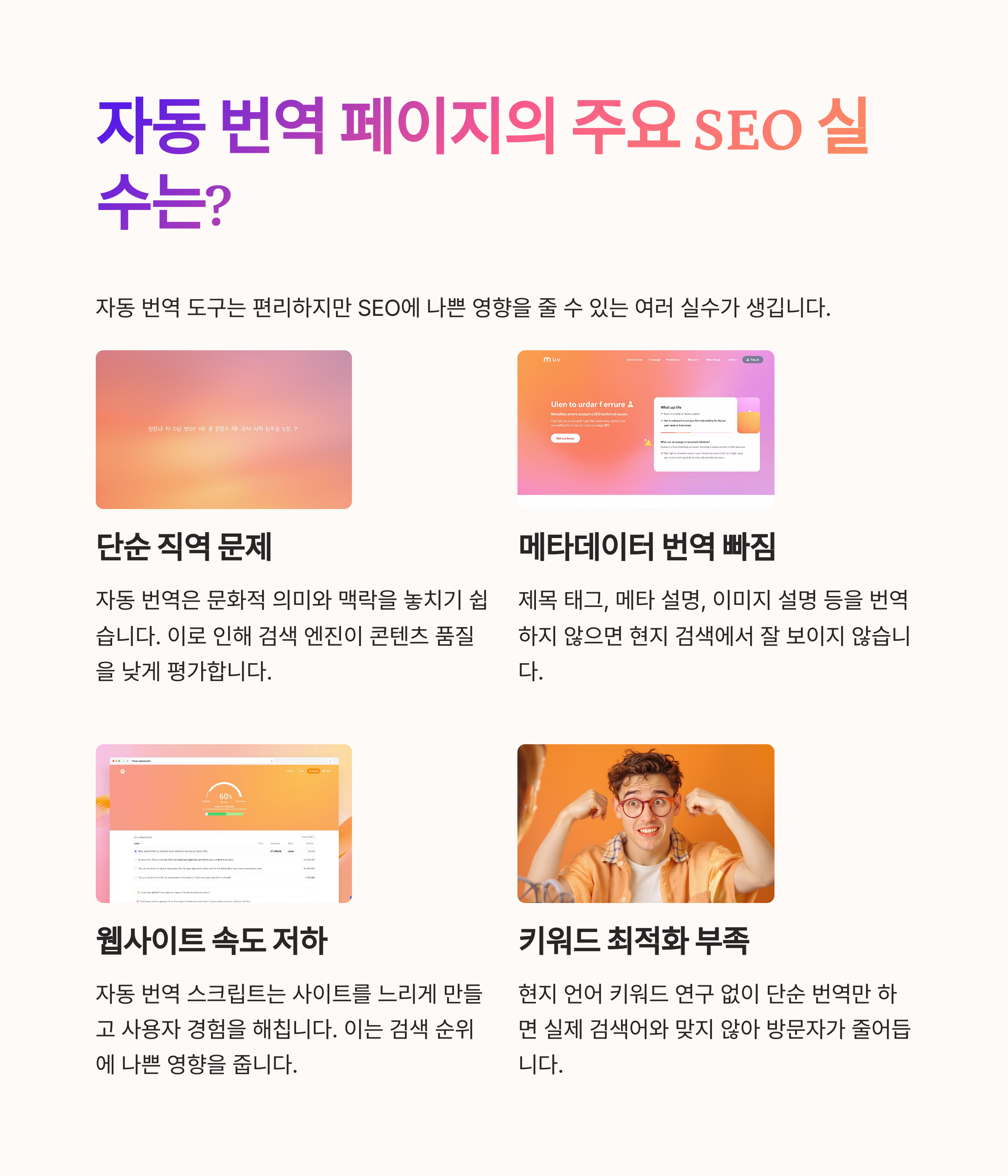 메타디스크립션 누락, 번역된 키워드 미포함, 동일 URL 구조 사용, hreflang 누락, 번역 중 CTA 어색함 등이 대표적 실수입니다.