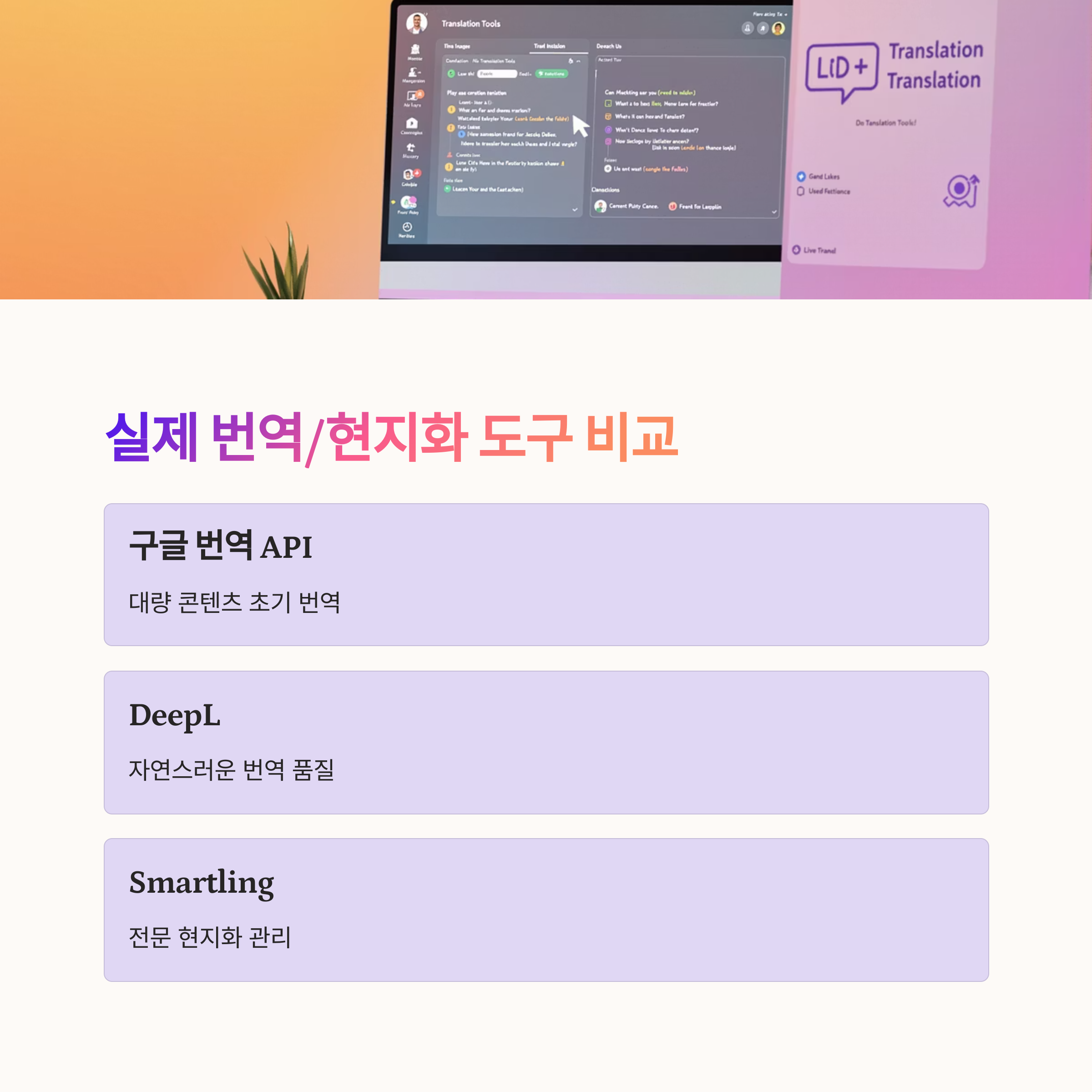 다국어 콘텐츠를 운영하려면 번역 툴만큼이나 워크플로우 자동화가 중요해요. 저희가 실제로 사용한 번역/현지화 도구와 각각의 특징은 다음과 같습니다.