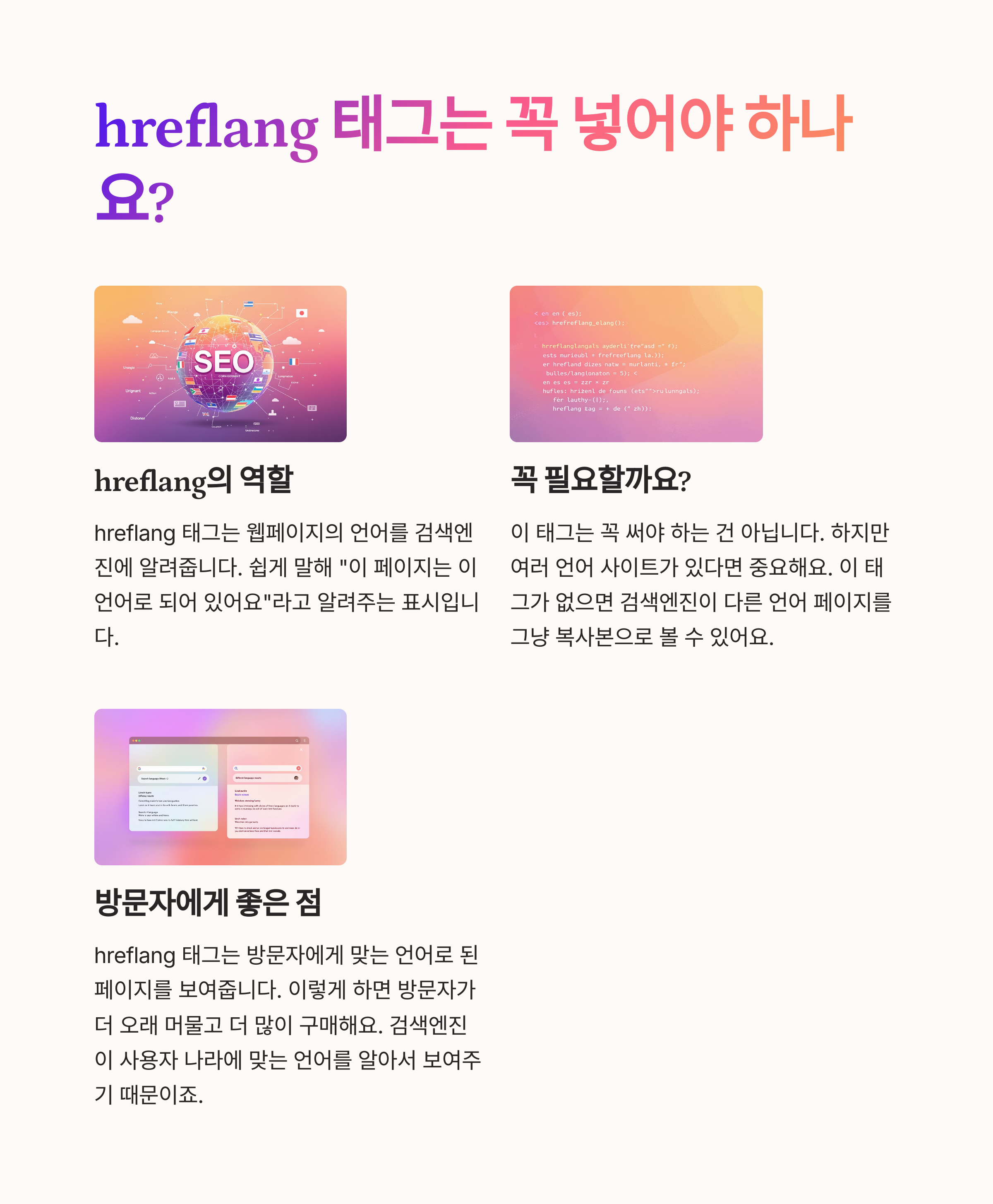 - hreflang 태그 적용 (en-us, fr-fr 등 언어+국가)