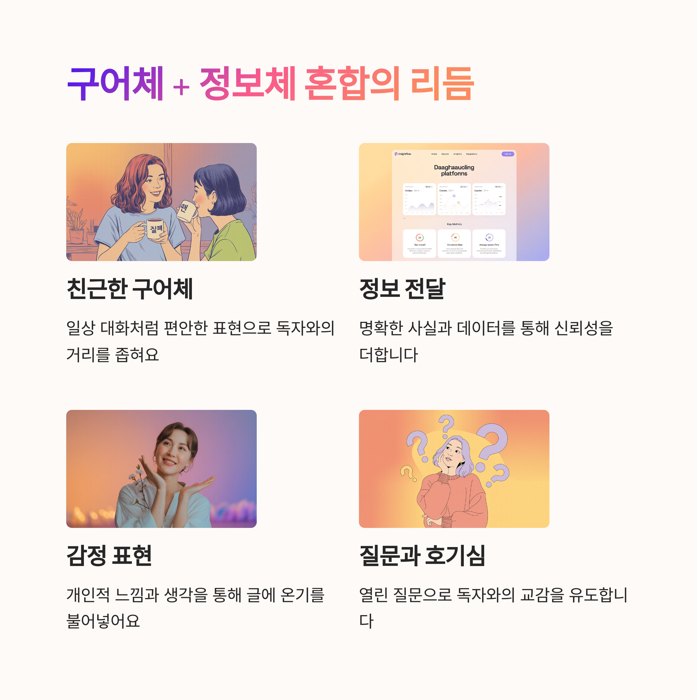 정보형 문장과 섞어 사용하면 오히려 리듬과 몰입도를 높입니다. 전부 구어체면 피로하지만, 부분 삽입은 인간성을 높여줍니다.