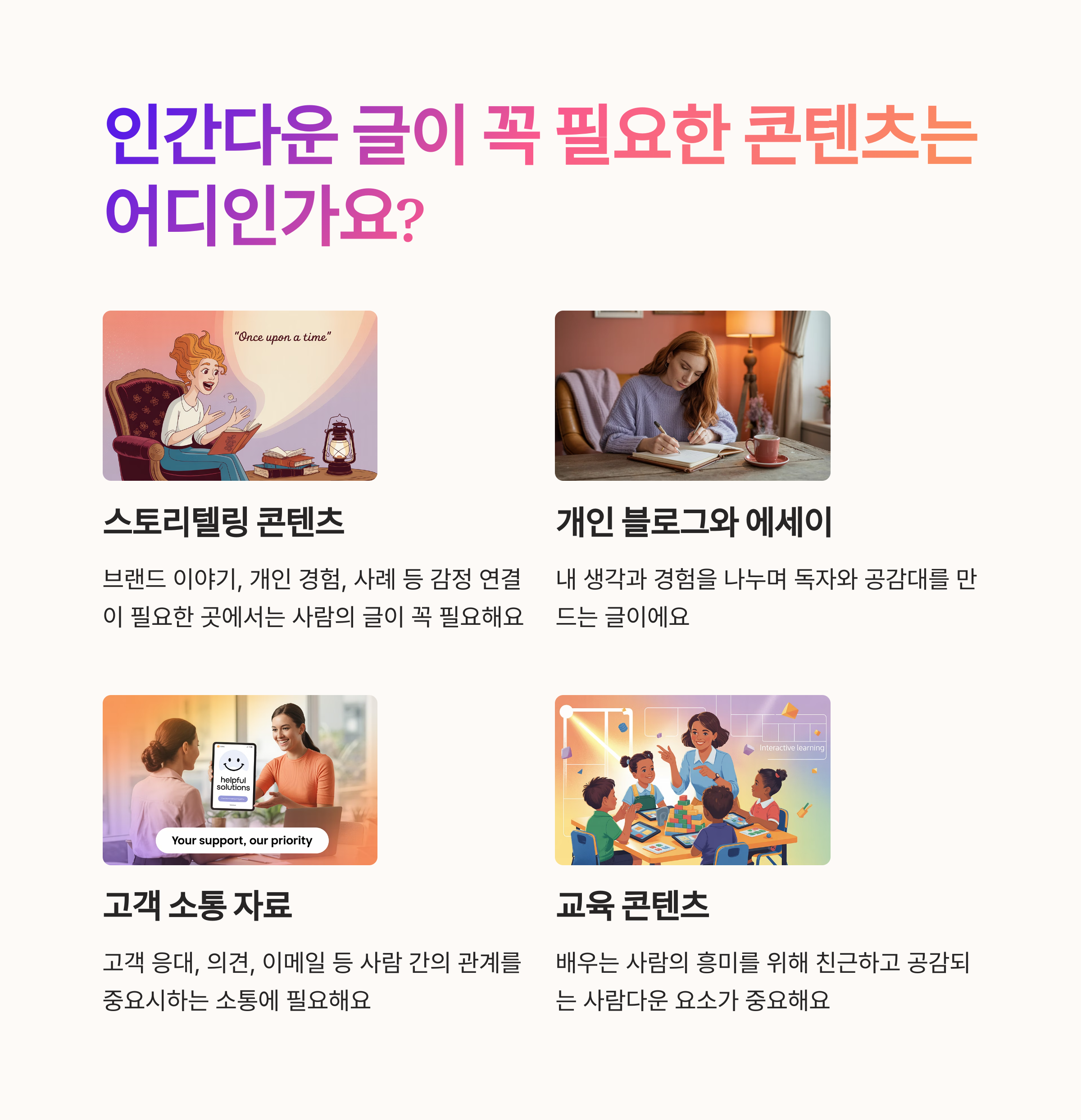 브랜딩, 마케팅, 에세이, 코칭, 서비스 소개 등 신뢰와 감정이 필요한 콘텐츠는 인간화 설계가 핵심입니다.