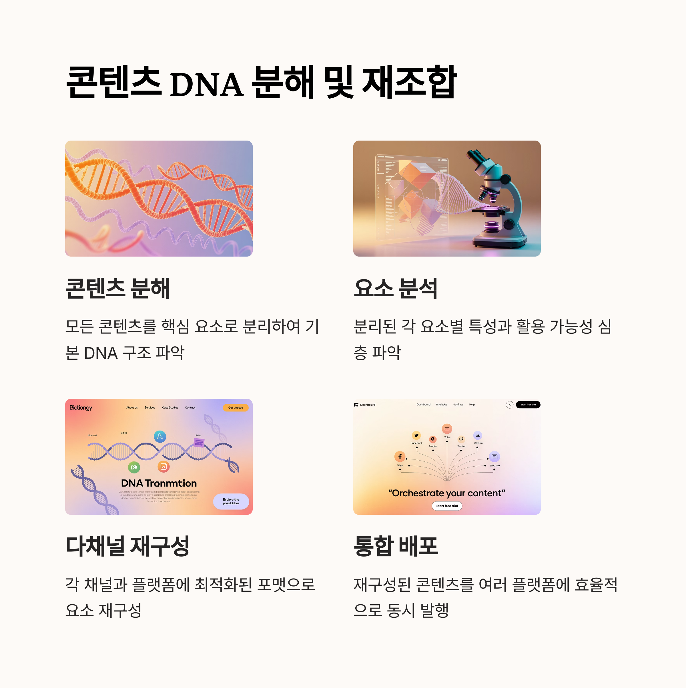 한 번 만든 콘텐츠를 다양한 채널에 자동 배포하려면, **내용의 재조합 가능성(DNA 분해)**이 선행되어야 합니다. GPT는 이 분해 작업을 자동으로 처리할 수 있습니다.