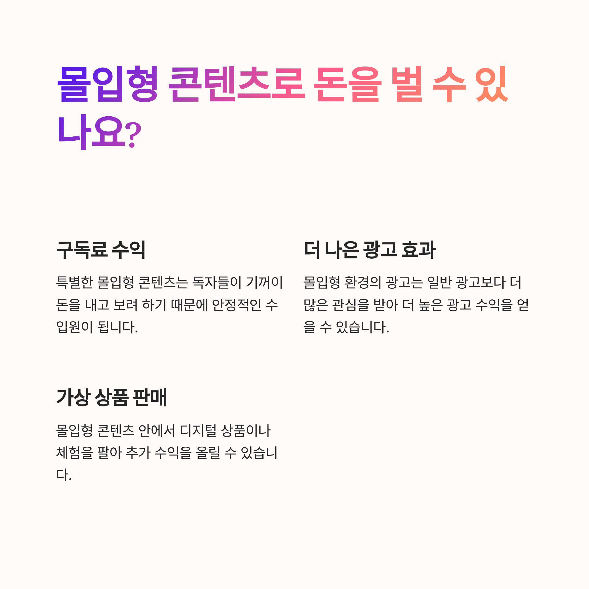 네. 체류 시간이 길고 브랜드 인상이 강하기 때문에 유료 구독, 브랜드 협찬, NFT, 광고 전환율까지 모든 지표가 상승하는 구조가 가능합니다.