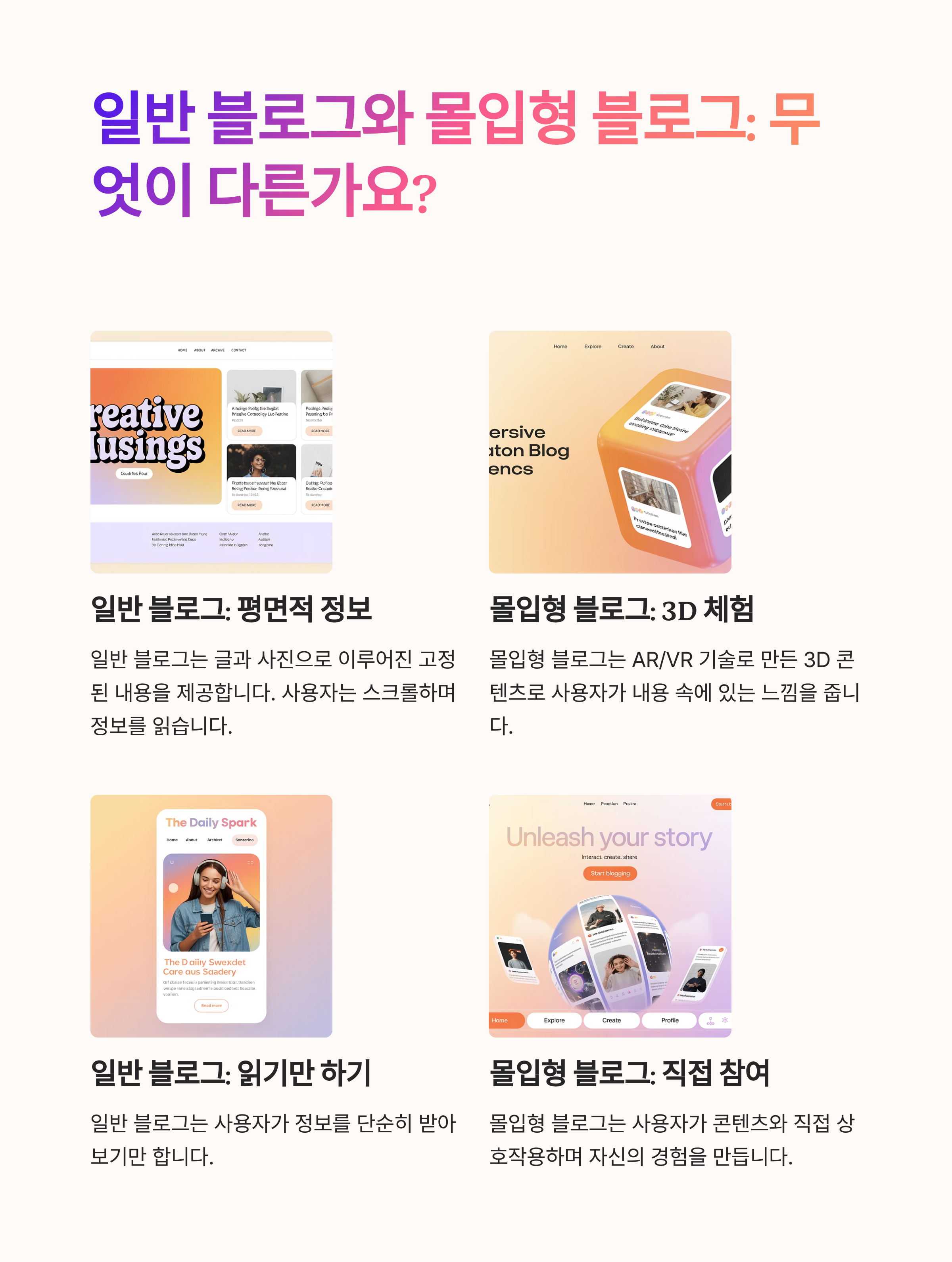 기존 블로그는 정보 중심, 몰입형 블로그는 ‘경험 중심’입니다. 영상, 음성, 3D 요소가 통합돼 스토리 흐름을 따라가며 콘텐츠를 체험할 수 있게 됩니다.