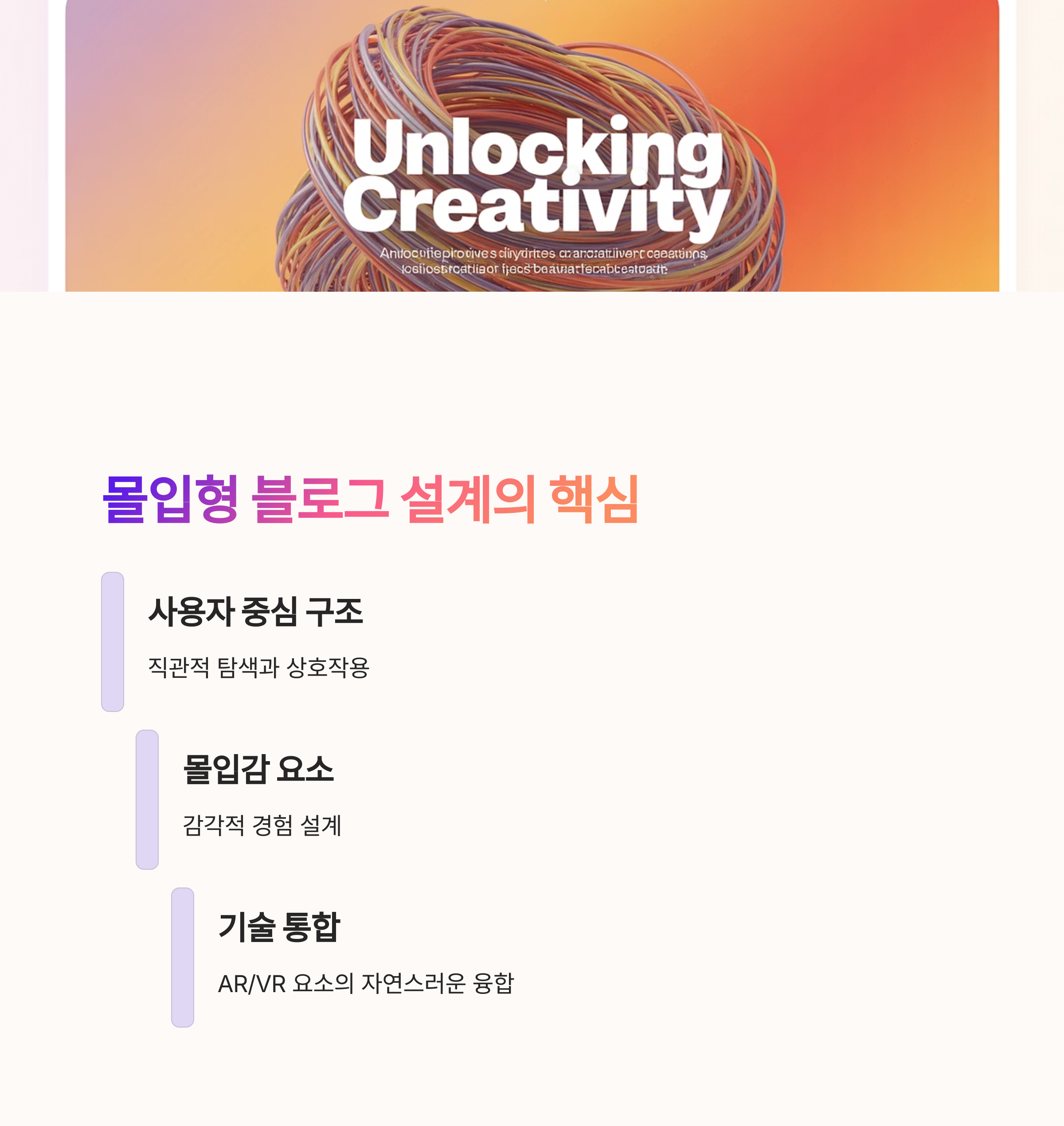 몰입형 블로그는 단순히 텍스트에 이미지 몇 장을 붙이는 것이 아니라, 콘텐츠 공간 자체가 ‘경험’이 되도록 설계돼야 해요. 스크롤 중심 구조 대신, 인터랙션 기반 내비게이션, 사용자 동선에 따라 변화하는 시각 요소, AI 내비게이터 아바타 등이 핵심이 됩니다. 콘텐츠의 ‘길이’보다 ‘방향’이 중요하고, 독자의 ‘탐색’을 유도하는 설계가 필요해요.