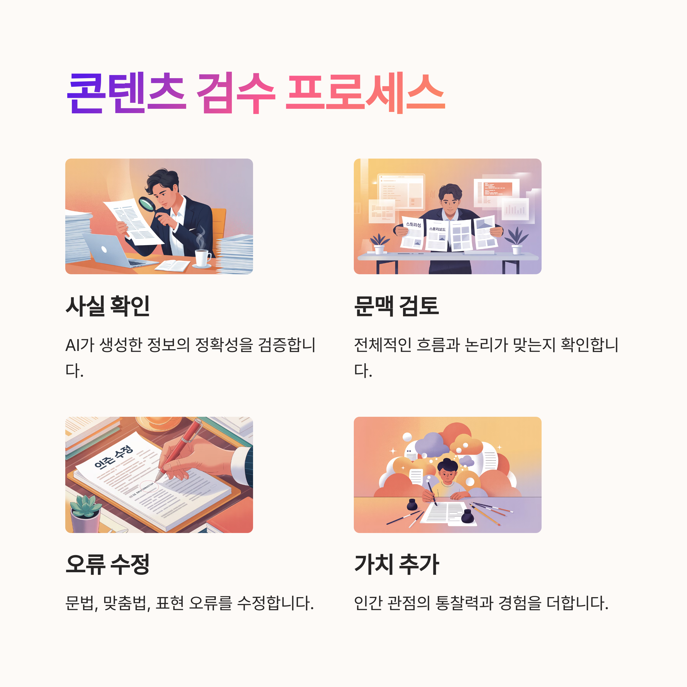 AI가 만들어낸 콘텐츠를 무작정 게시하는 건 위험한 선택입니다. 제가 콘텐츠를 올리기 전 반드시 거치는 검수 루틴이 있어요. 마치 출판사에서 교정지를 확인하듯이요. 핵심은 사람이 ‘마지막 책임’을 진다는 점이에요. GPT가 아무리 똑똑하더라도, 말실수나 맥락 오류는 여전히 발생하거든요.