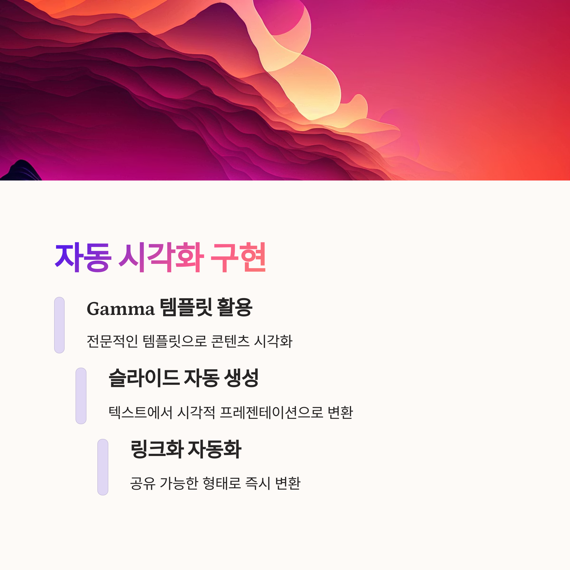 GPT로 설계된 콘텐츠는 Gamma를 통해 즉시 프레젠테이션, PDF, 링크 콘텐츠로 시각화 자동화할 수 있습니다. 특히 슬라이드마다 ‘감정–정보–행동’ 모듈을 템플릿화하면 어떤 콘텐츠도 일관된 브랜딩 구조로 표현됩니다.