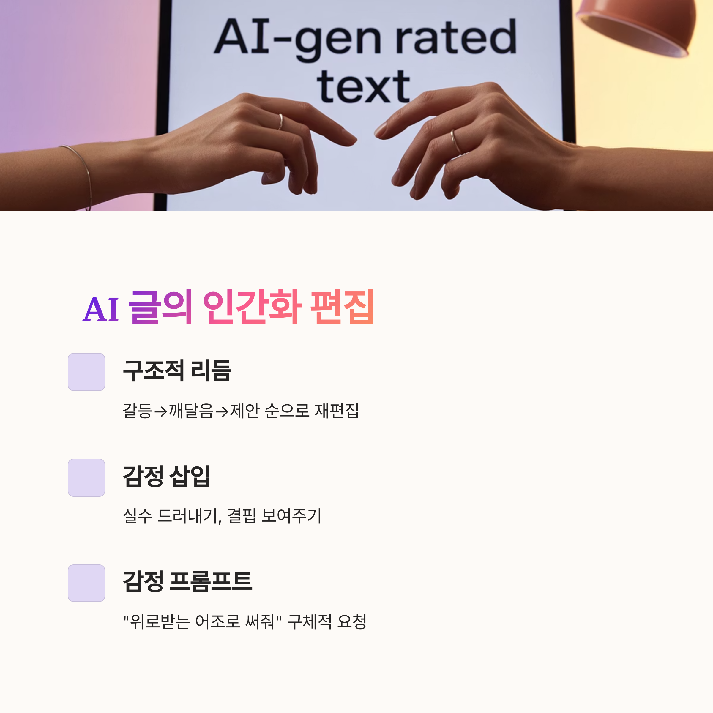 - GPT 감정 프롬프트: “읽는 이가 위로받는 어조로 써줘” 등의 구체적 요청 사용